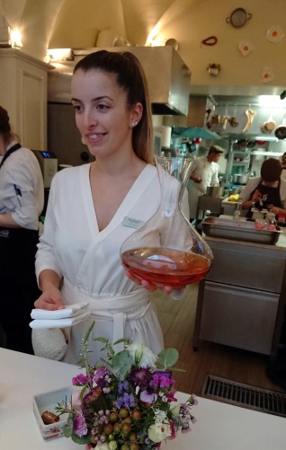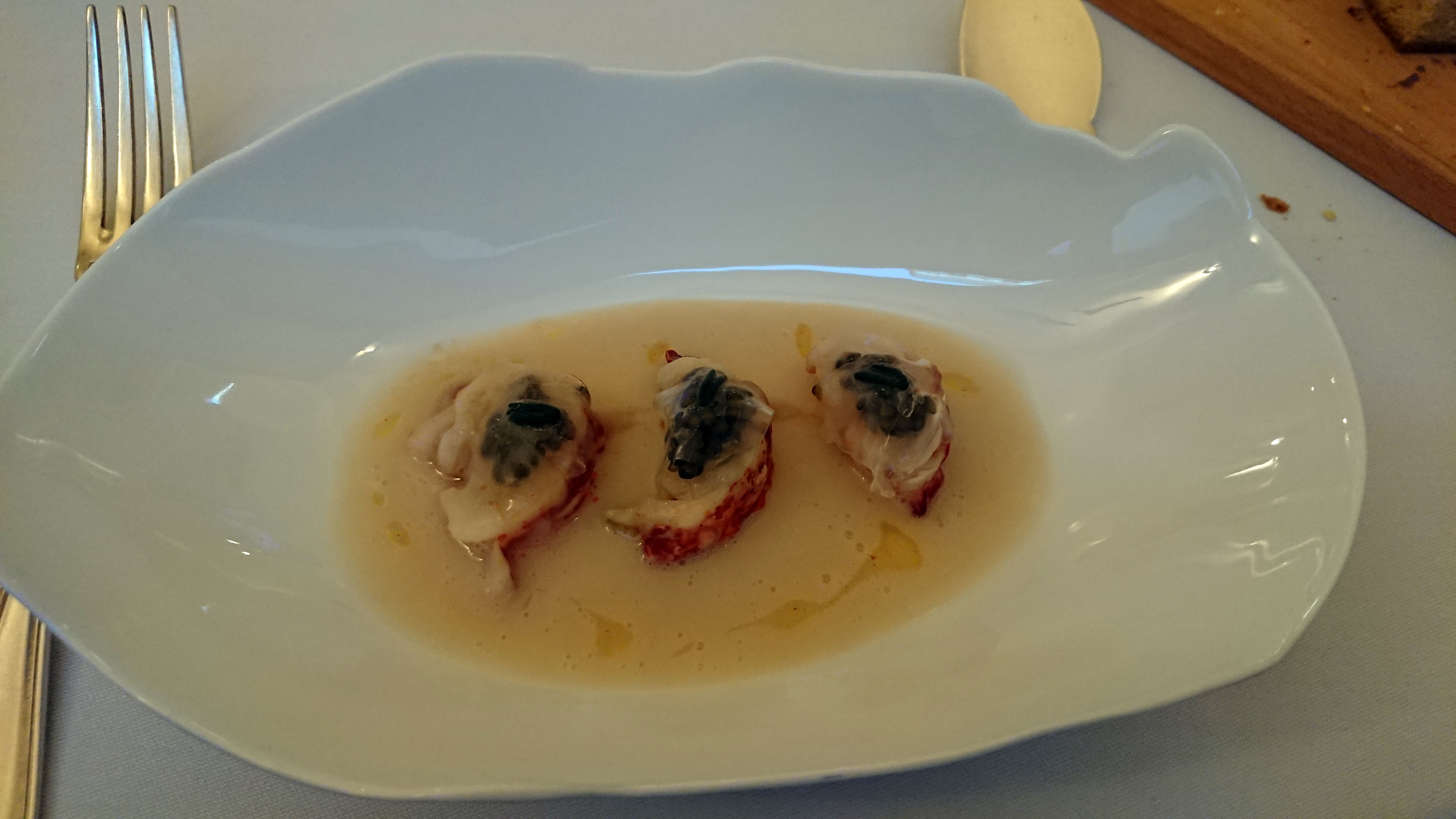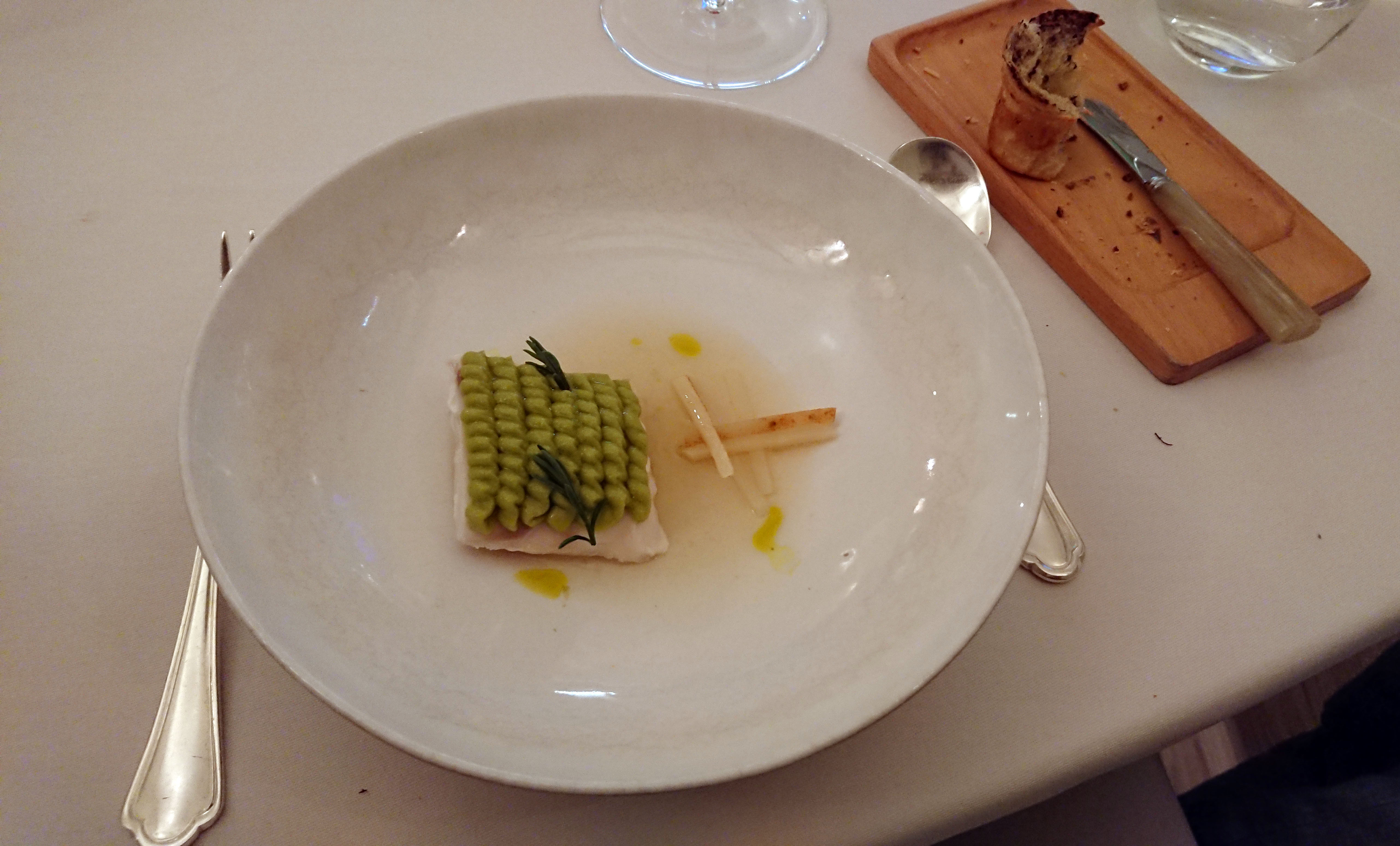 In no time Sommelier Nadia Desiderio extracted the cork of 1985 white Dao and poured its amber contents into our glasses, so that we barely had time to analyse the first dish, “Dirty elderini with spherical olive” (El Bulli 2005), while registering that it was delicious. Then the second of those 16 dishes was placed before us with a flourish by Maître d’hôtel Luis Reis: Cod and chickpea “stones” which looked very like the kind of pebbles you find on a beach but which were, in fact, eminently chewable as well as being sapid. A playful item that entertained the palate.