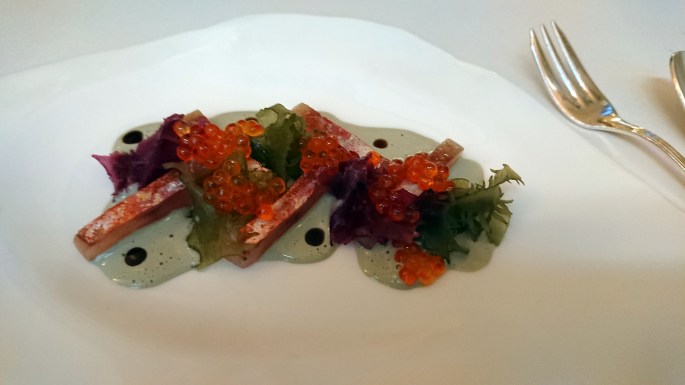 Next, Azorean tuna “bouquet””, a tiny feather-light cornet encasing a blend of seaweed and tuna. Then a third variation on the sea: cured red mullet, flecked with seaweed, with trout roe and pumpkin-seed puree. Then another variation on the marine theme: Razor clams with shavings of lupin bean ice, given extra intensity by a blob of sea urchin and green peach. Now another wave from the ocean: Lobster with haricots blancs, marrow, and caviar. The lobster, almost raw, had that special delicacy only found in cool waters. In complete contrast was an intensely flavoured dish centering on the unique scarlet Algarve prawn – the size of a langoustine – done in two ways. First, in maize “porridge”, then with the head in a crust of beetroot salt, moistened with a wondrous sauce, the very essence of shellfish at its very best.